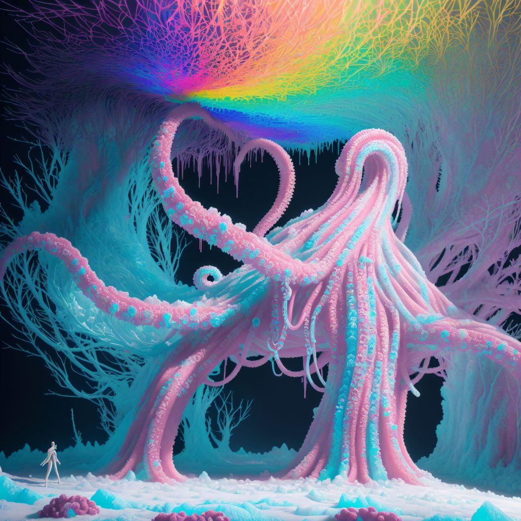 As you navigate through the tunnels, you hear a sound akin to a cosmic roar, the fabric of the universe ripping apart – a noise beyond any you’ve ever encountered. Rounding a bend, you stand face-to-face with a DMT vision, an octopus-like being with no clear head and hundreds of pink and blue tentacles.